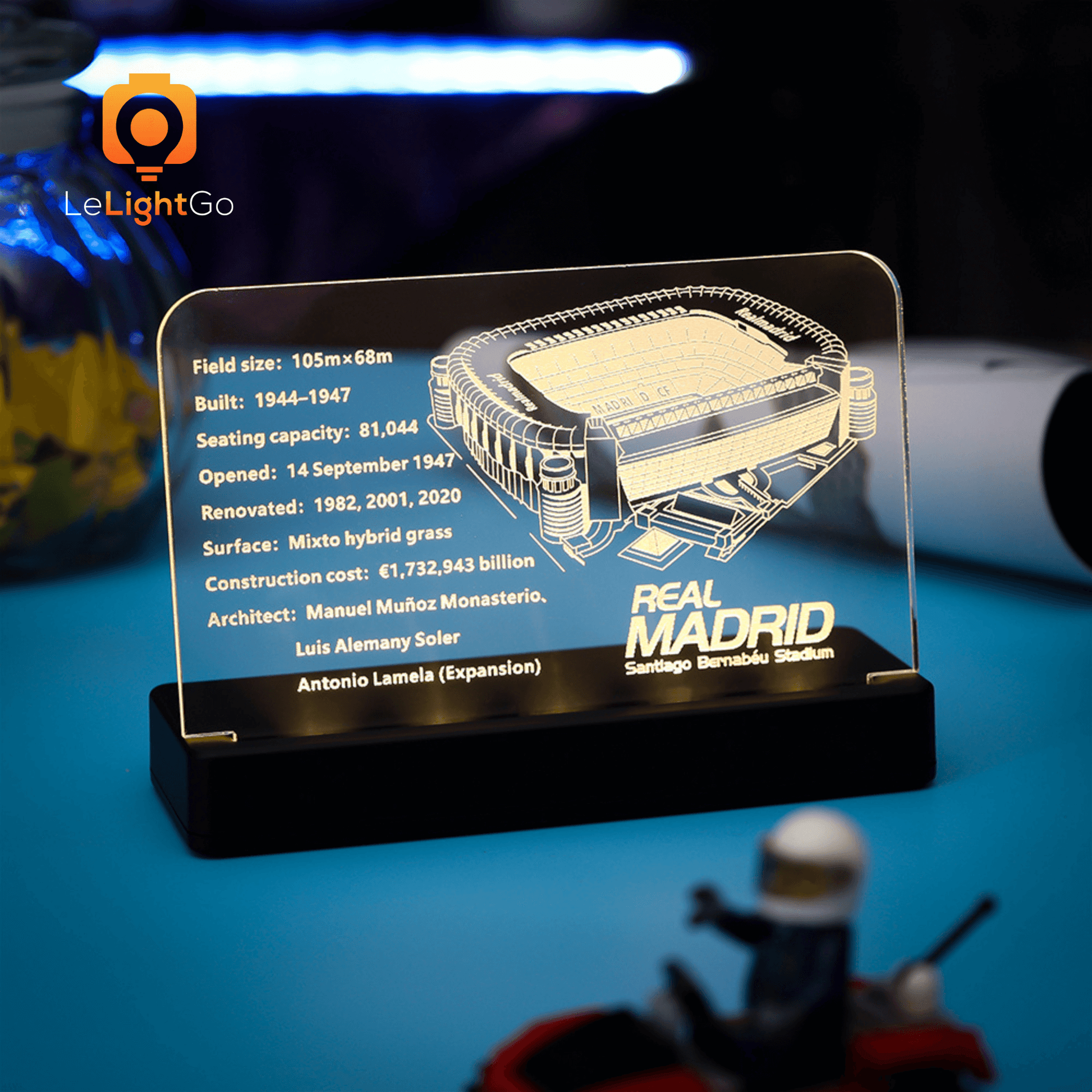- Clear acrylic nameplate is designed specifically for Real Madrid – Santiago Bernabéu Stadium Lego set, the personalized nameplates with graphics and basic information about the LEGO set.