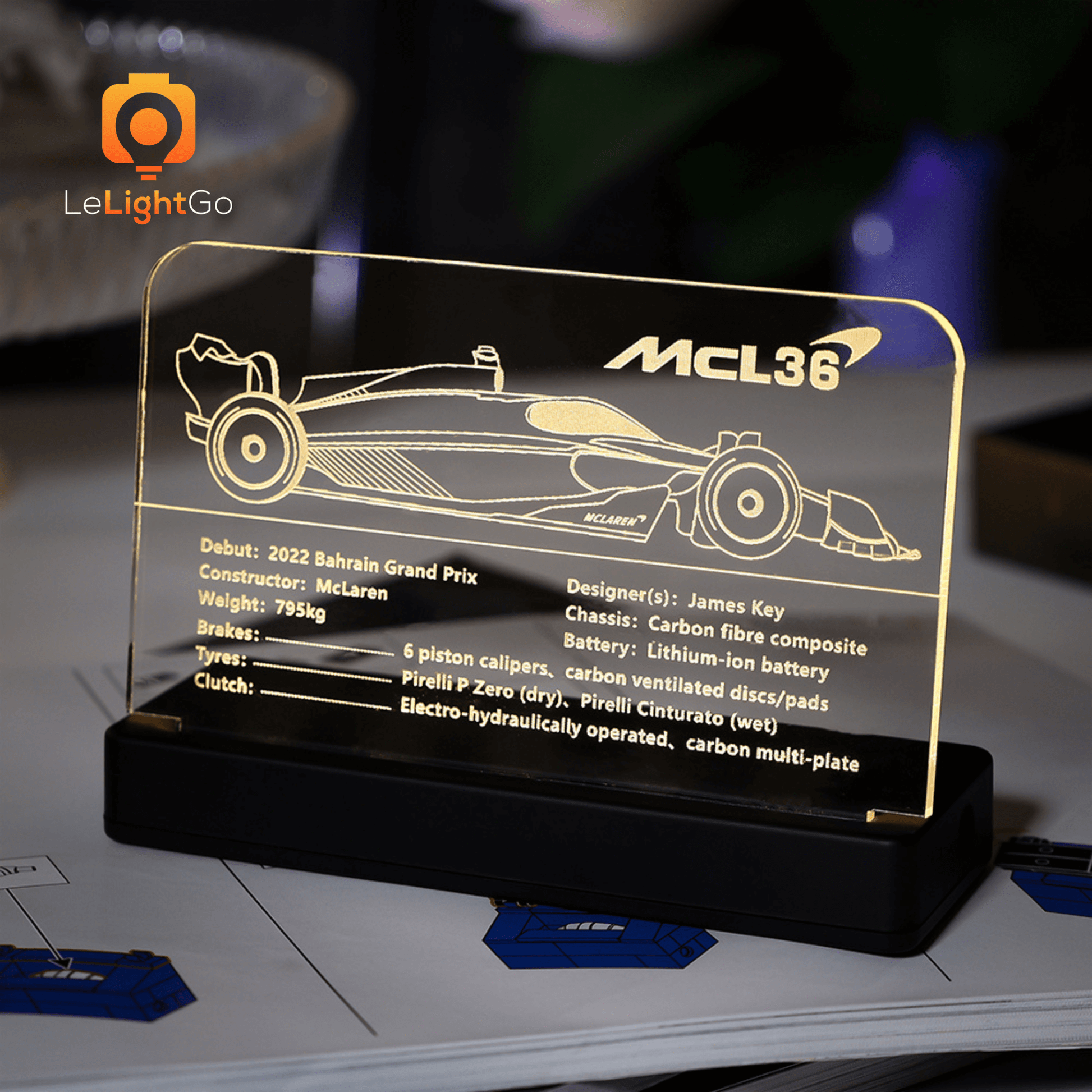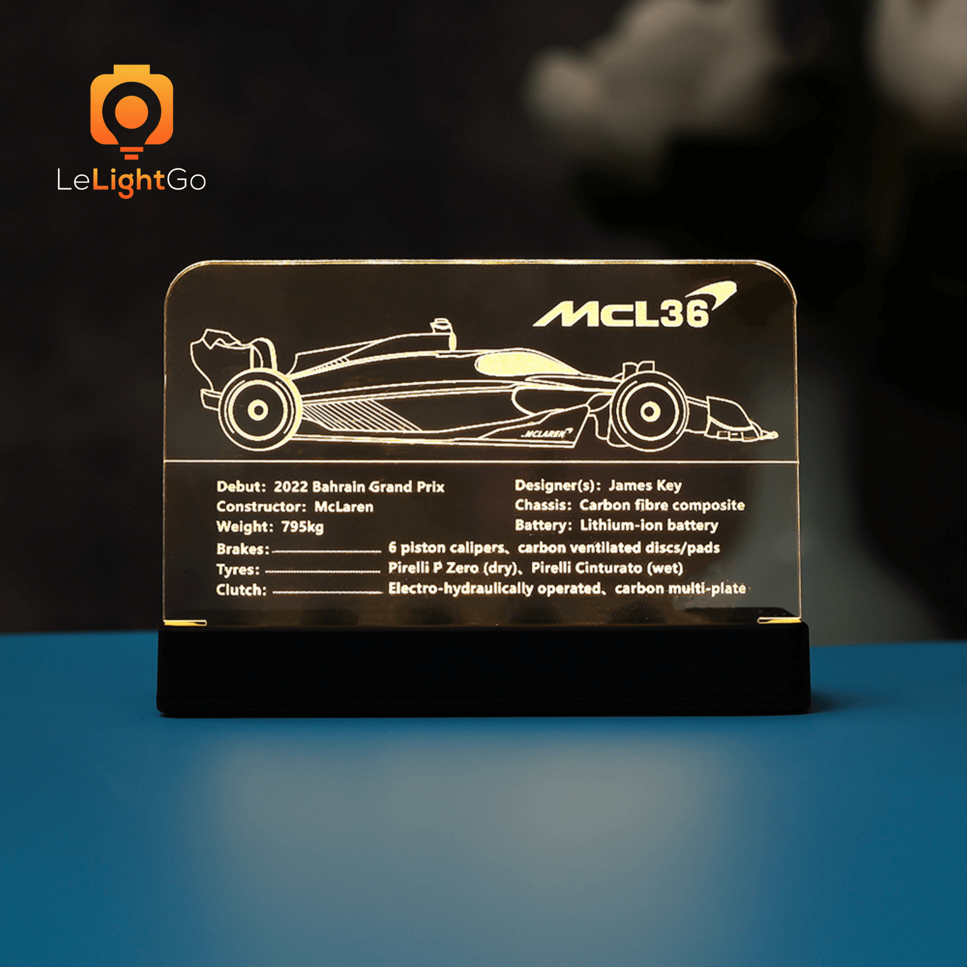 Making McLaren Formula 1 Race Car LEGO set more entertaining to see is different from actually building it. Use our fantastic LED Nameplates for LEGO McLaren Formula 1 Race Car to exhibit your favorite McLaren Formula 1 Race Car set. The nameplates artfully display the set's name along with fascinating facts about the model, the function, the type of the set, and other exciting details.