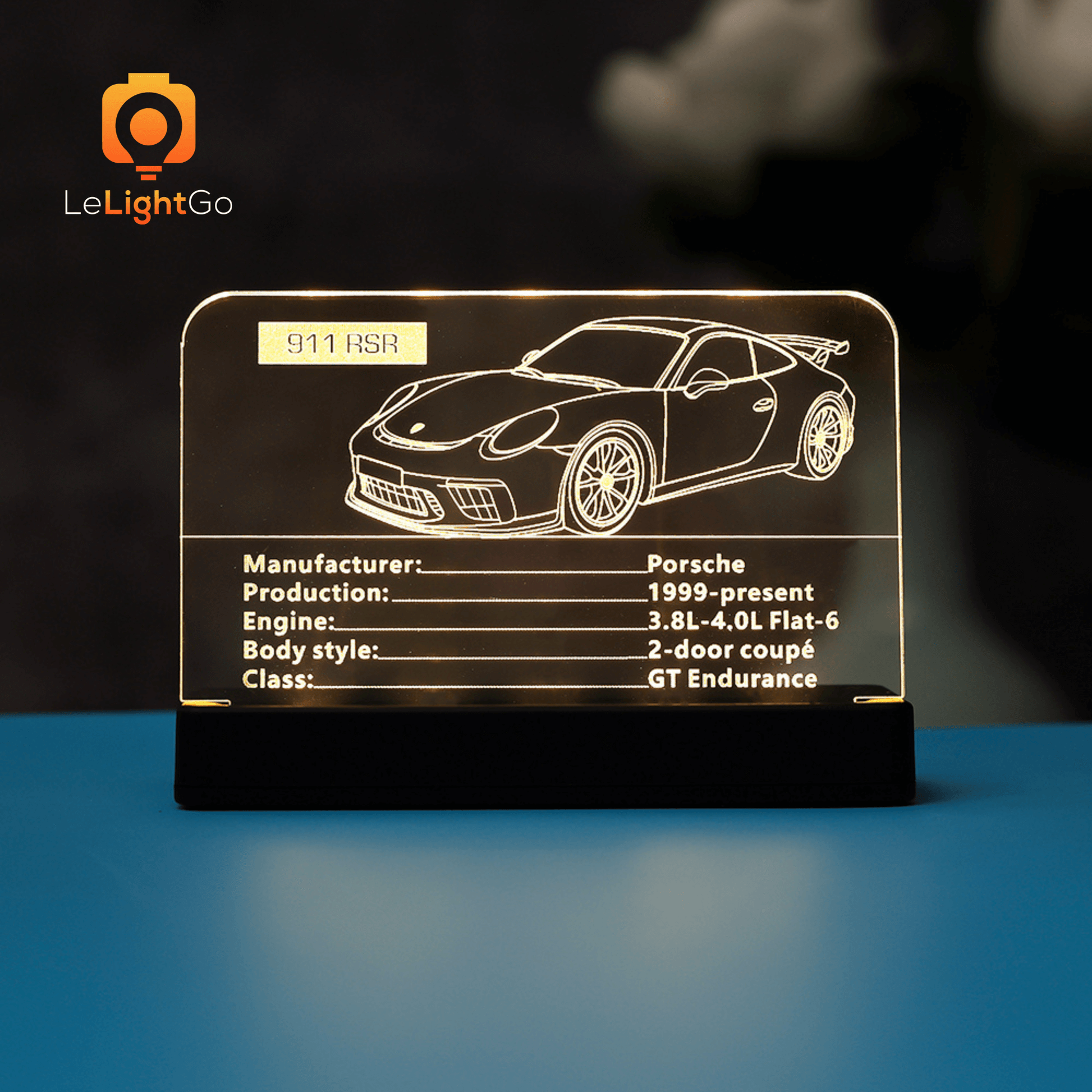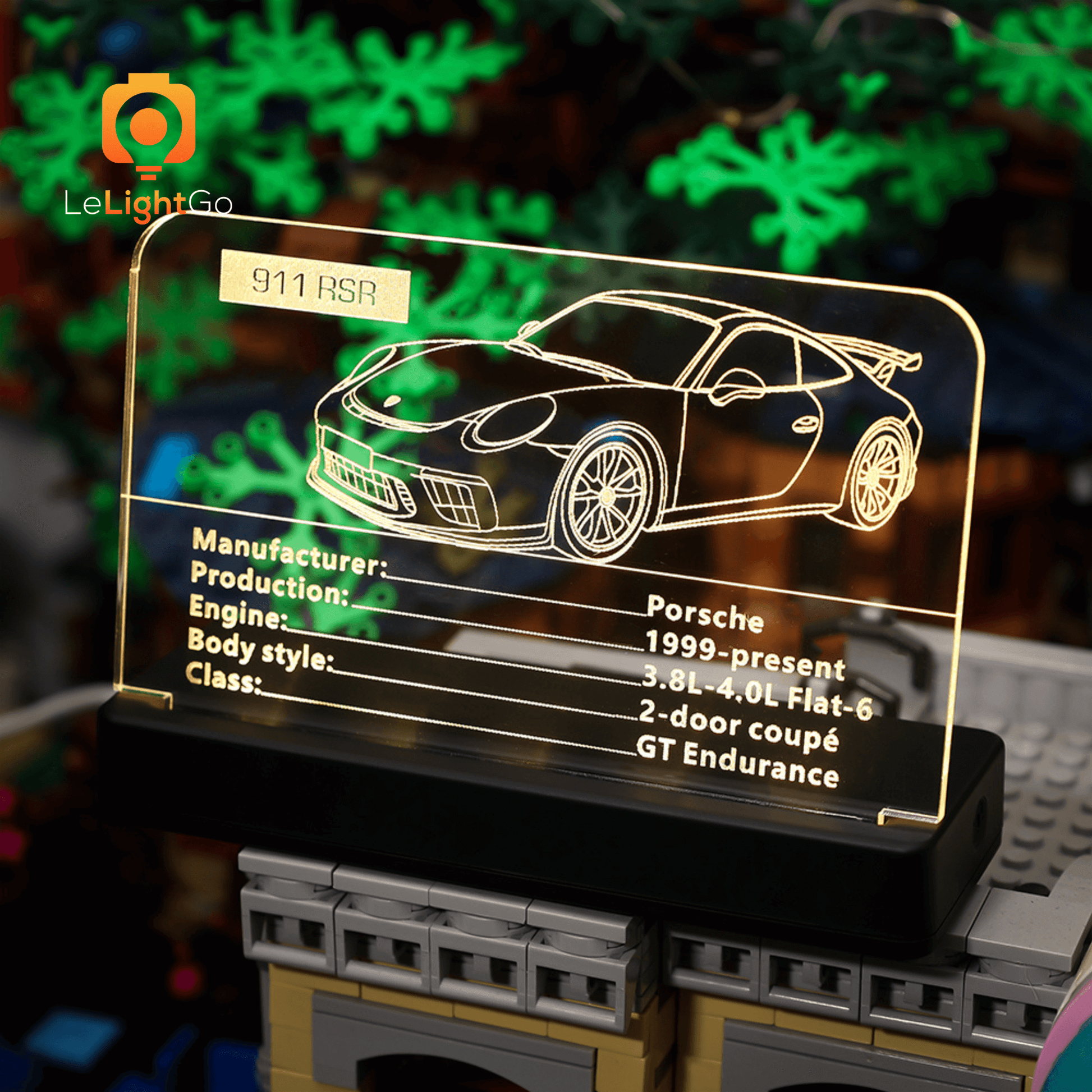 - Clear acrylic nameplate is designed specifically for Porsche 911 RSR Lego set, the personalized nameplates with graphics and basic information about the LEGO set.