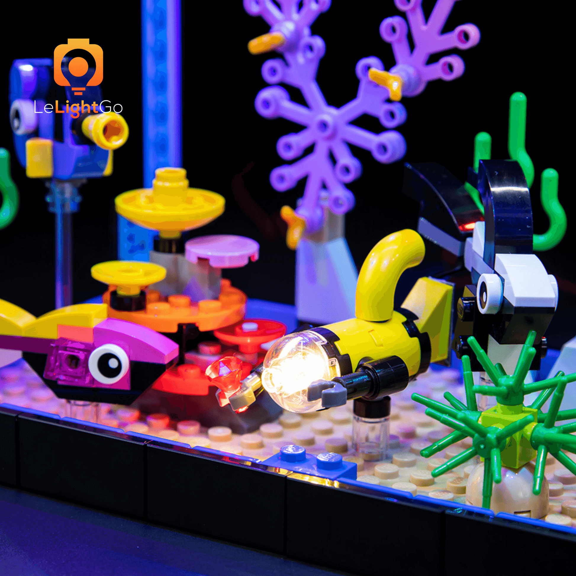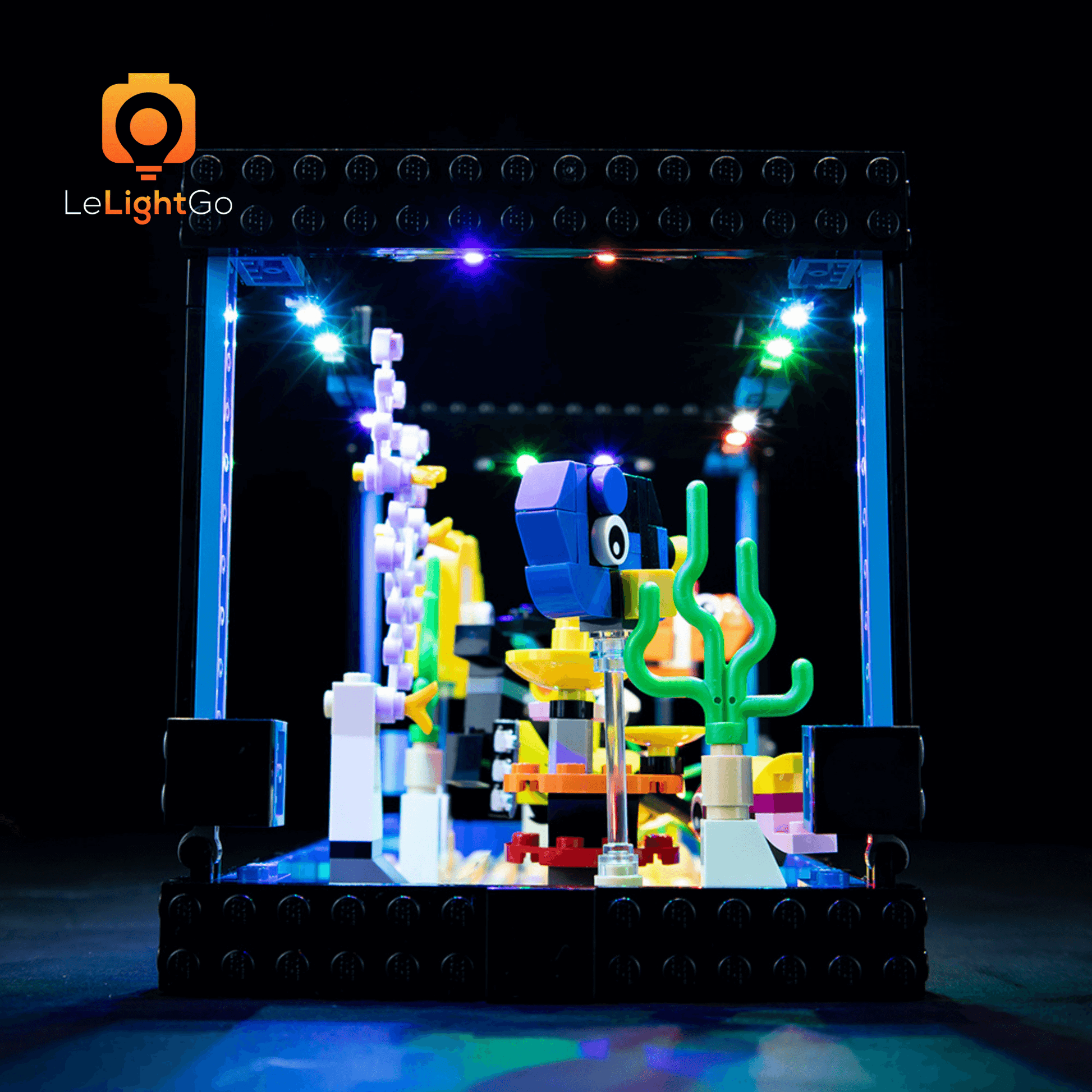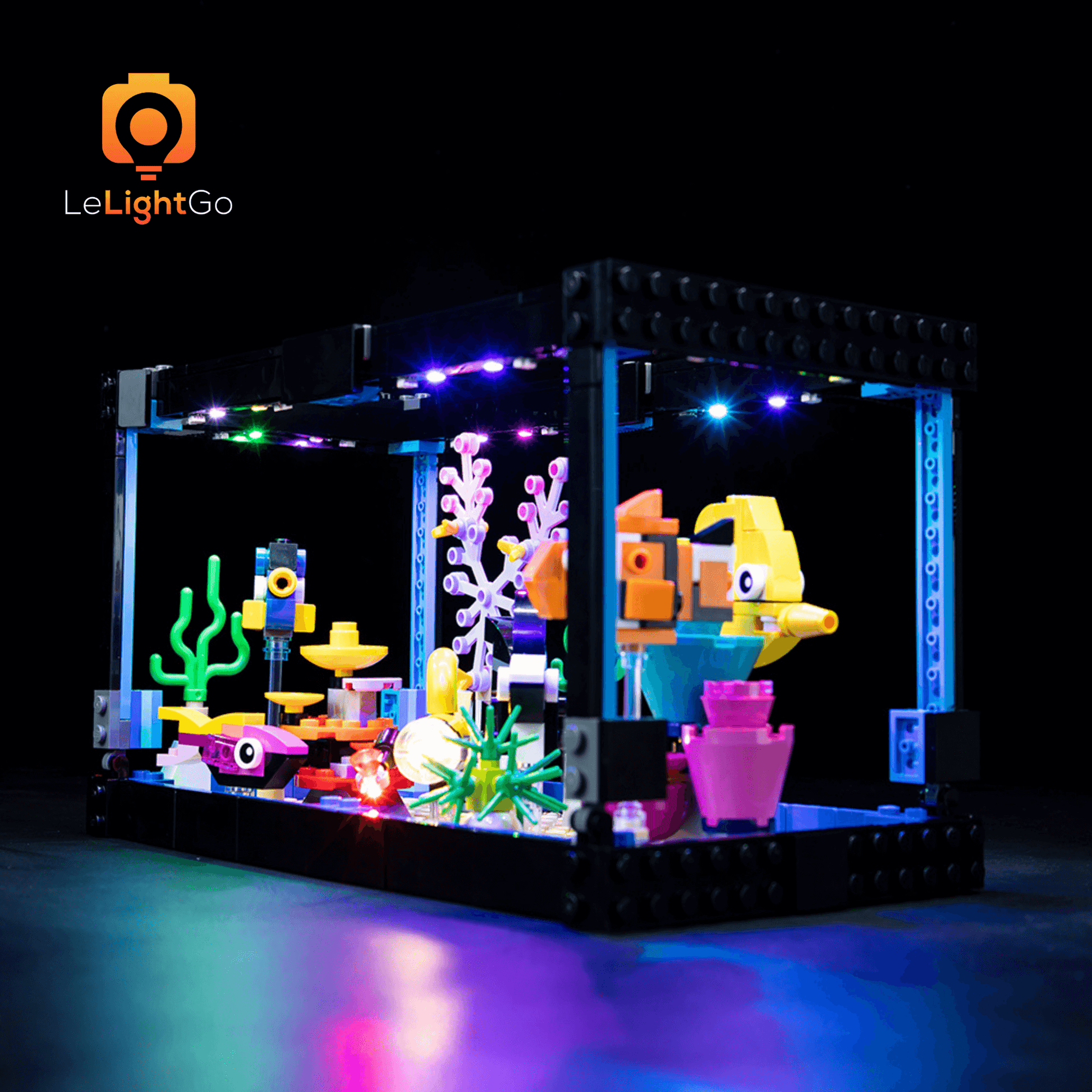 Bring magical shine to your Fish Tank 31122. This lighting kit is designed especially for the Lego CREATOR Fish Tank 31122. This highly detailed Lego model is a spectacle in itself, but when paired with the LeLightGo lighting kit, the charming model comes alive, not only during the day but also at night.