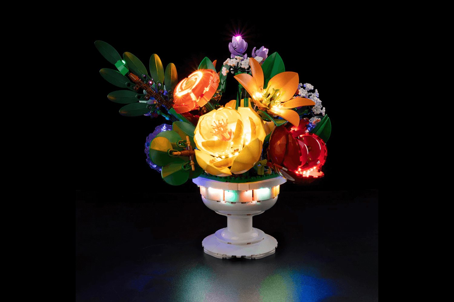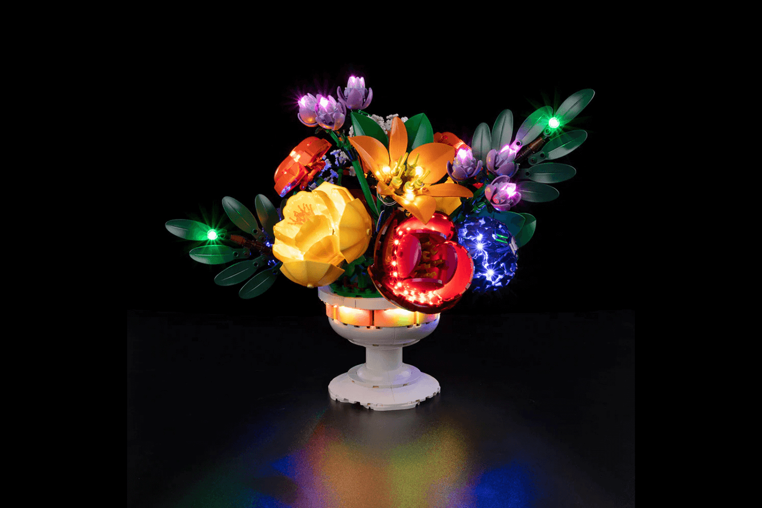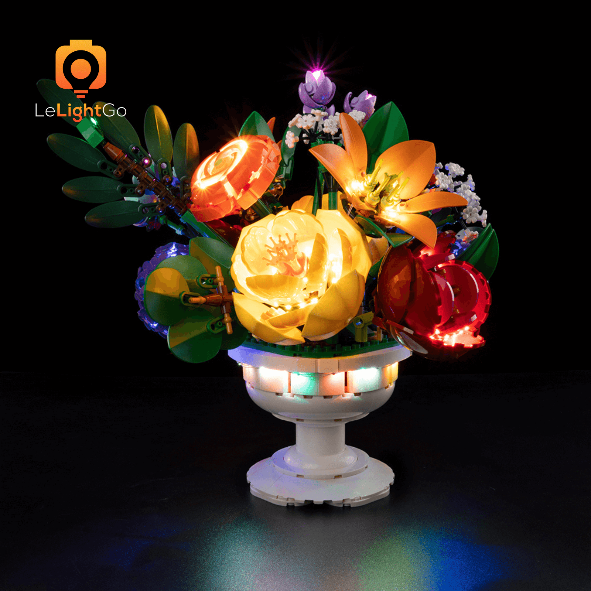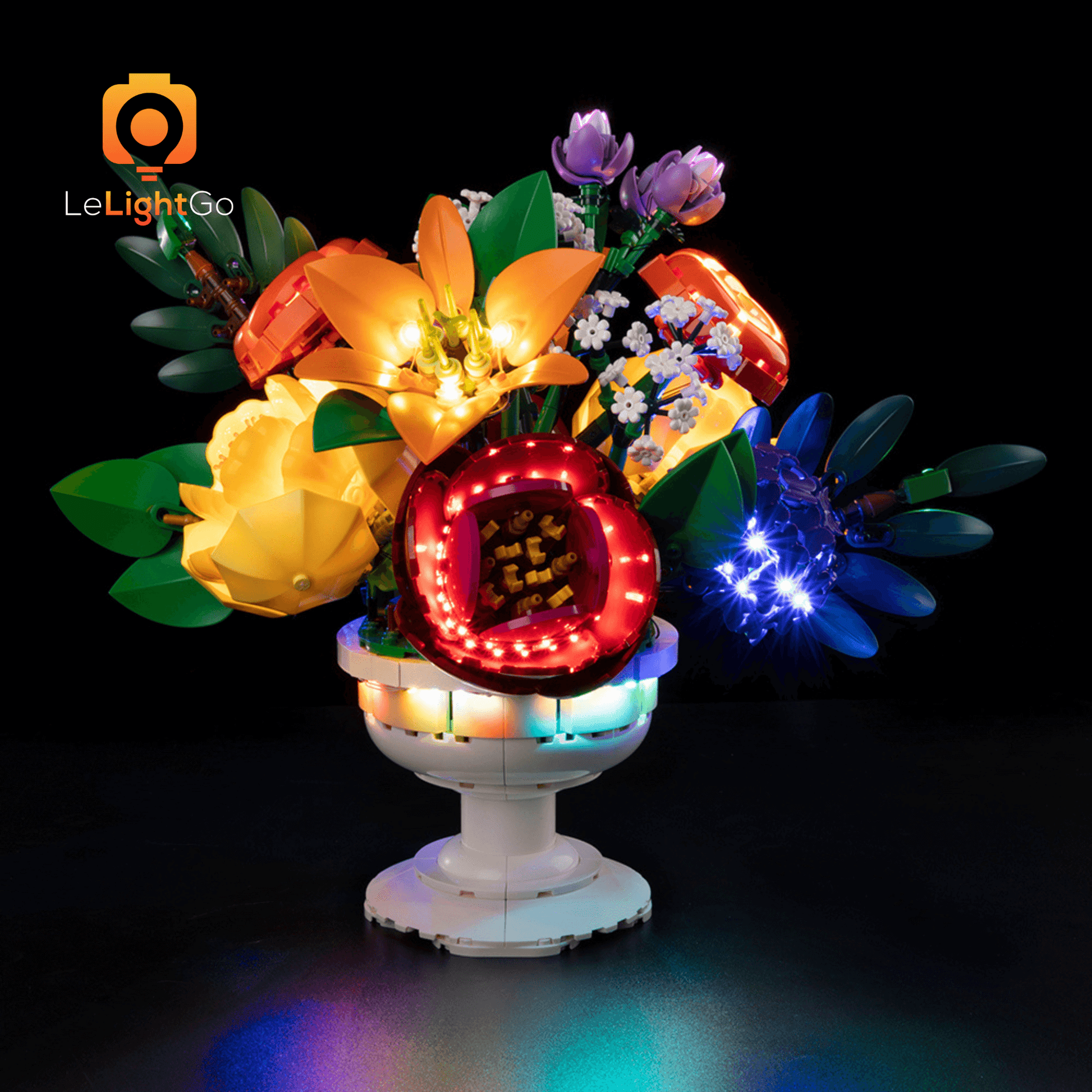 Bring magical shine to your Flower Arrangement 10345 This lighting kit is designed especially for the Lego Botanicals Flower Arrangement 10345. This highly detailed Lego model is a spectacle in itself, but when paired with the LeLightGo lighting kit, the charming model comes alive, not only during the day but also at night.
