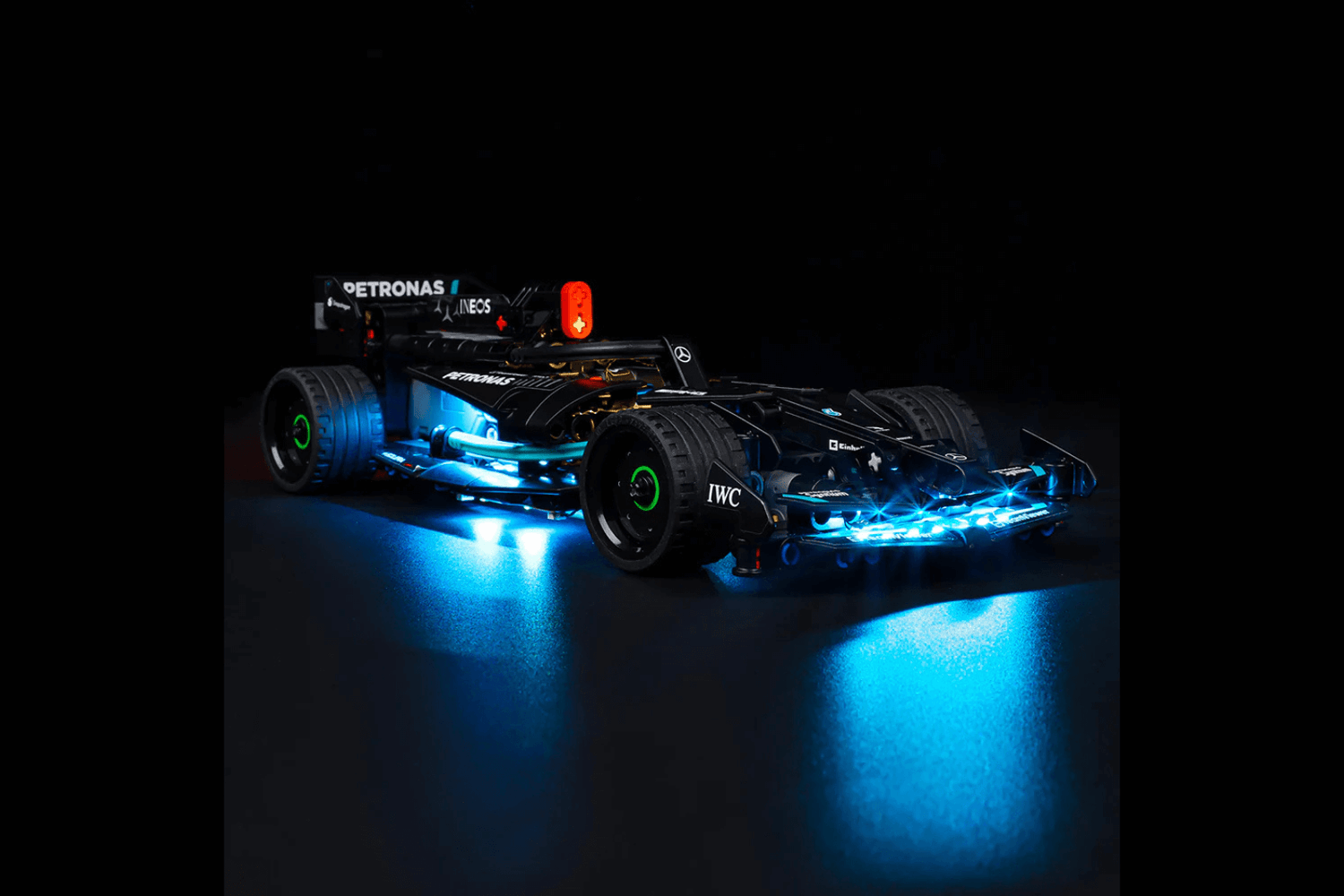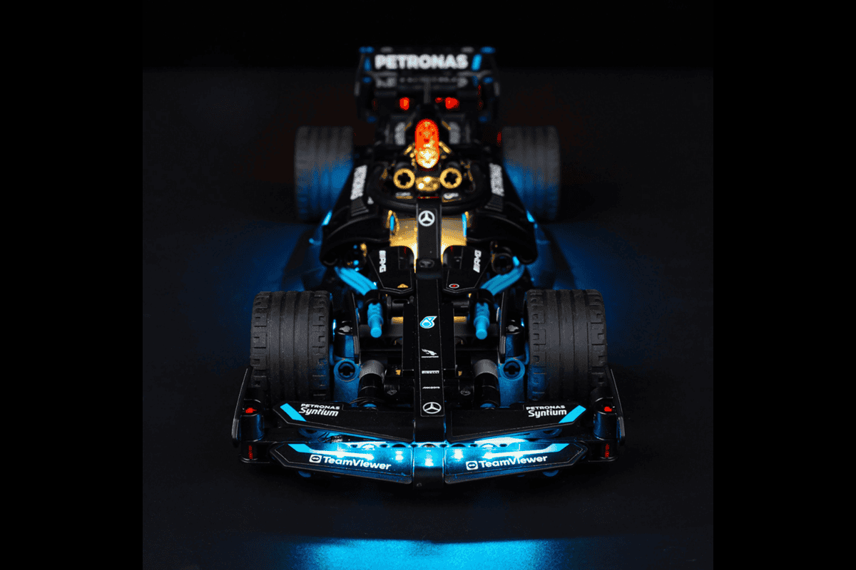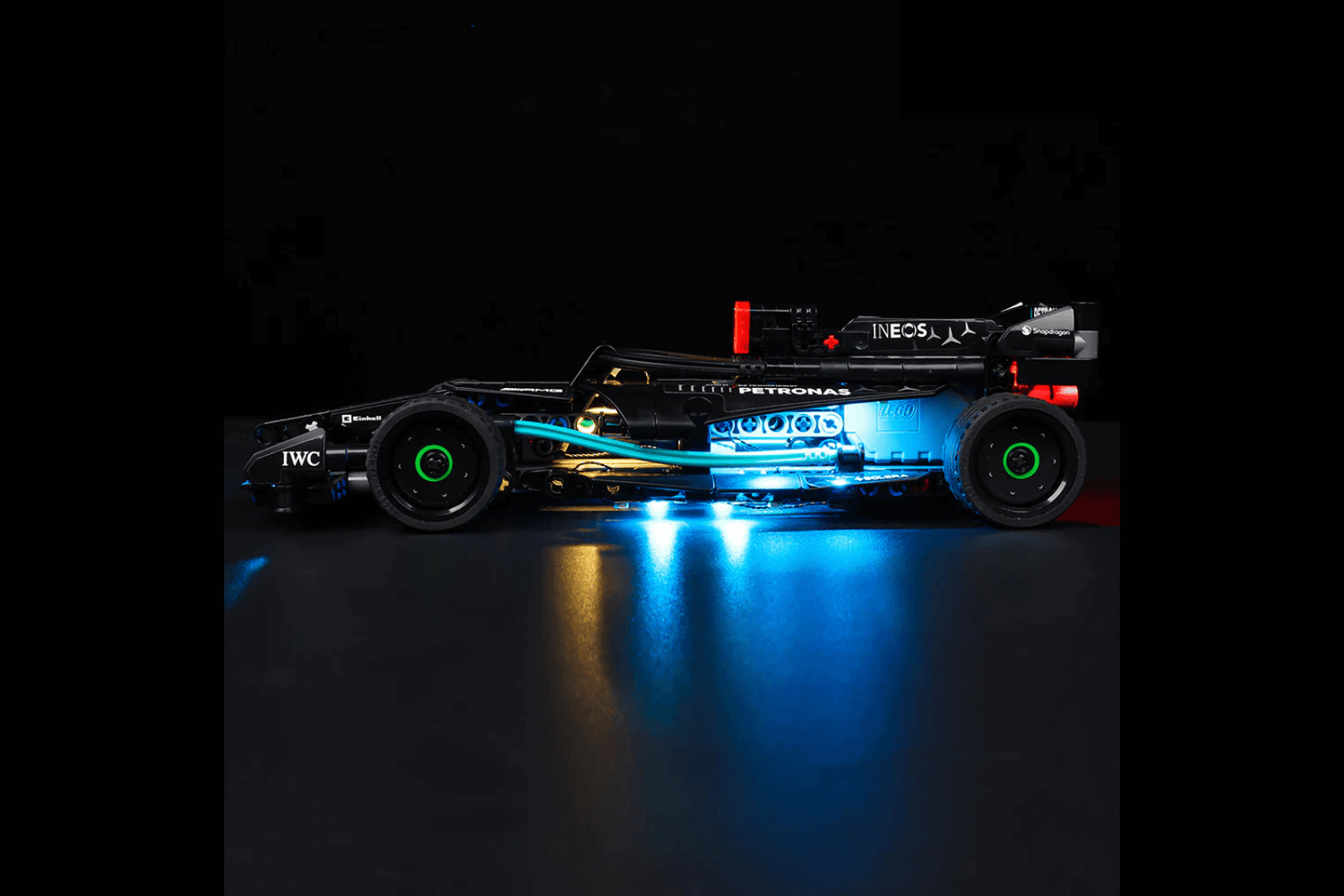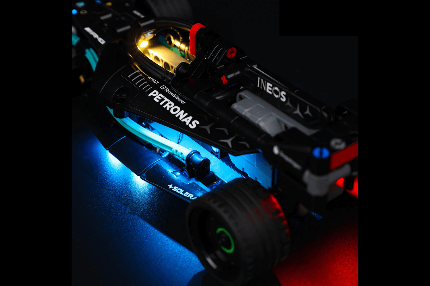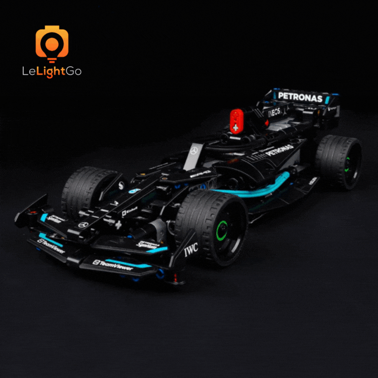 Bring magical shine to your Mercedes-AMG F1 W14 E Performance Pull-Back 42165. This lighting kit is designed especially for the Lego Technic Mercedes-AMG F1 W14 E Performance Pull-Back 42165. This highly detailed Lego model is a spectacle in itself, but when paired with the LeLightGo lighting kit, the charming model comes alive, not only during the day but also at night.
