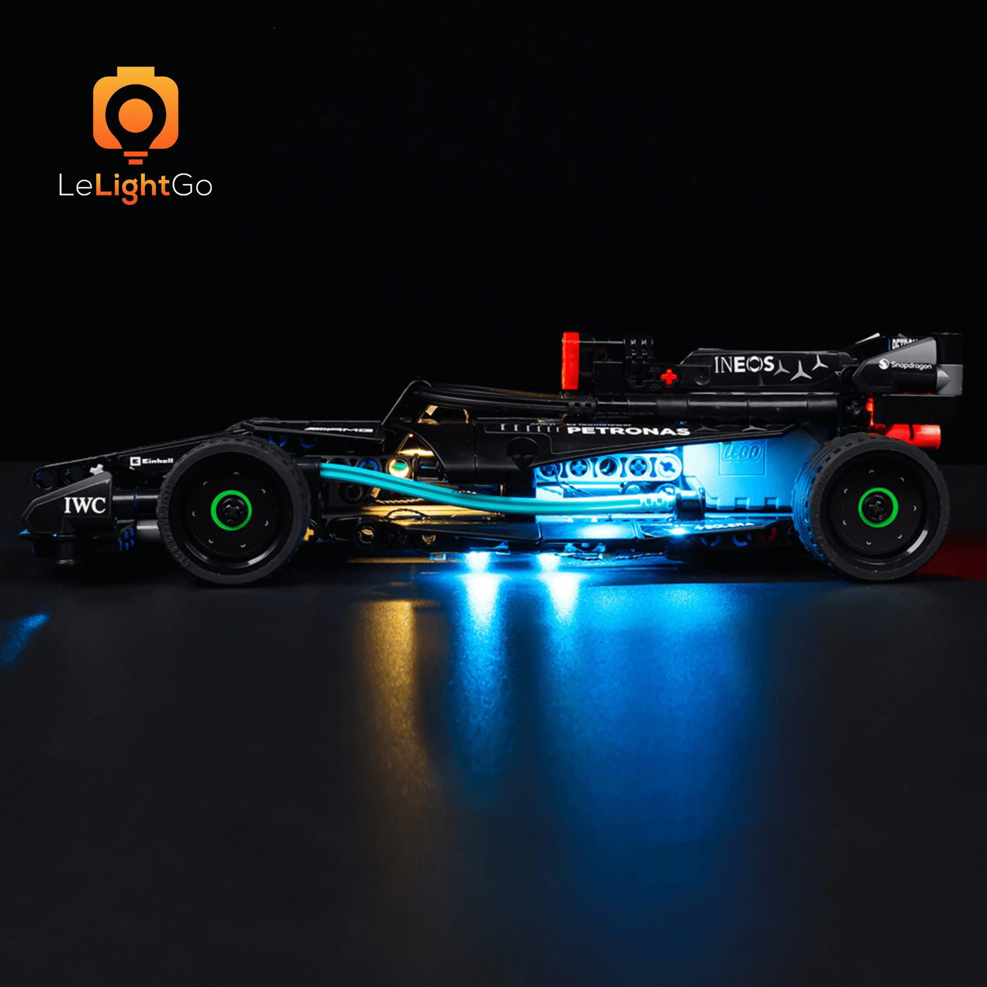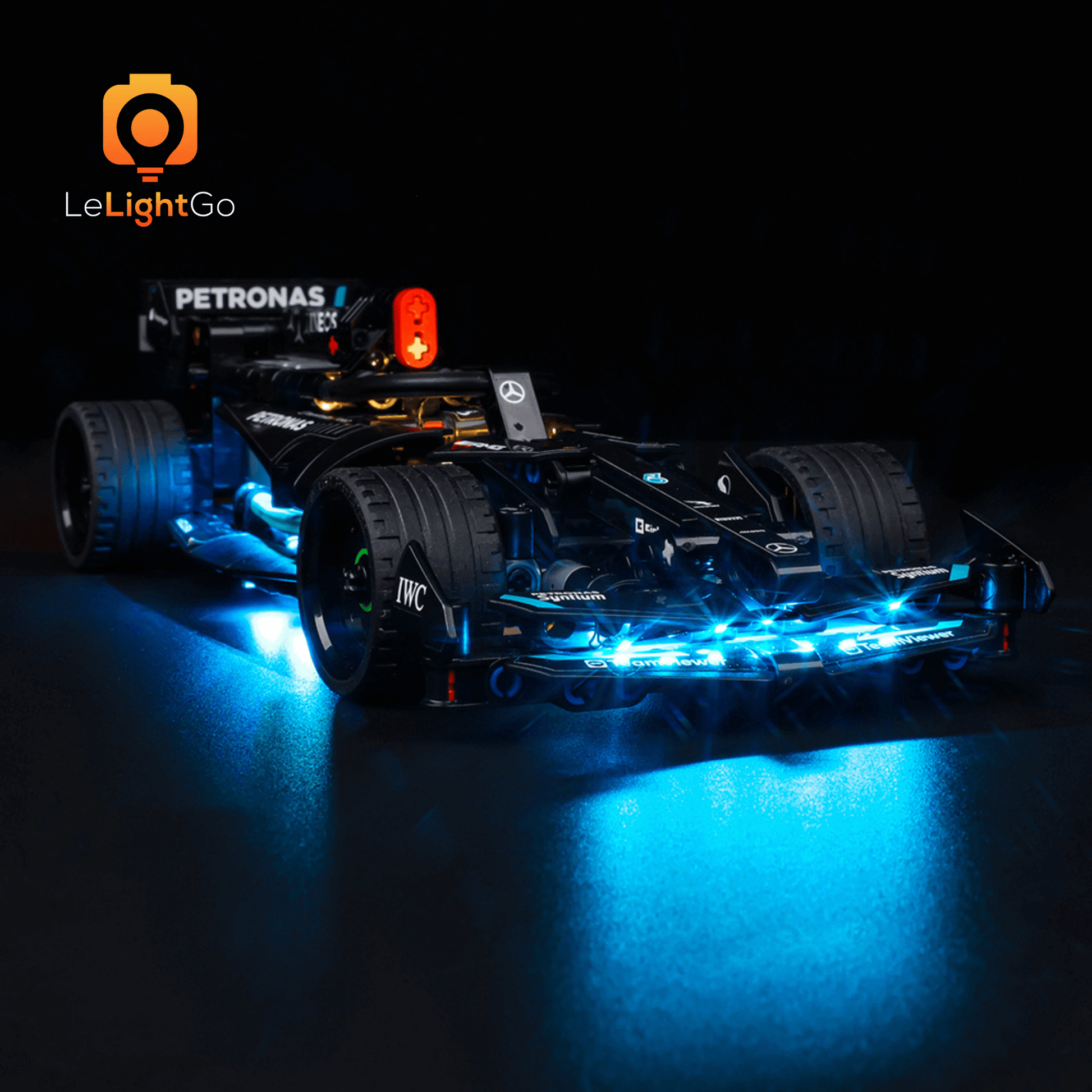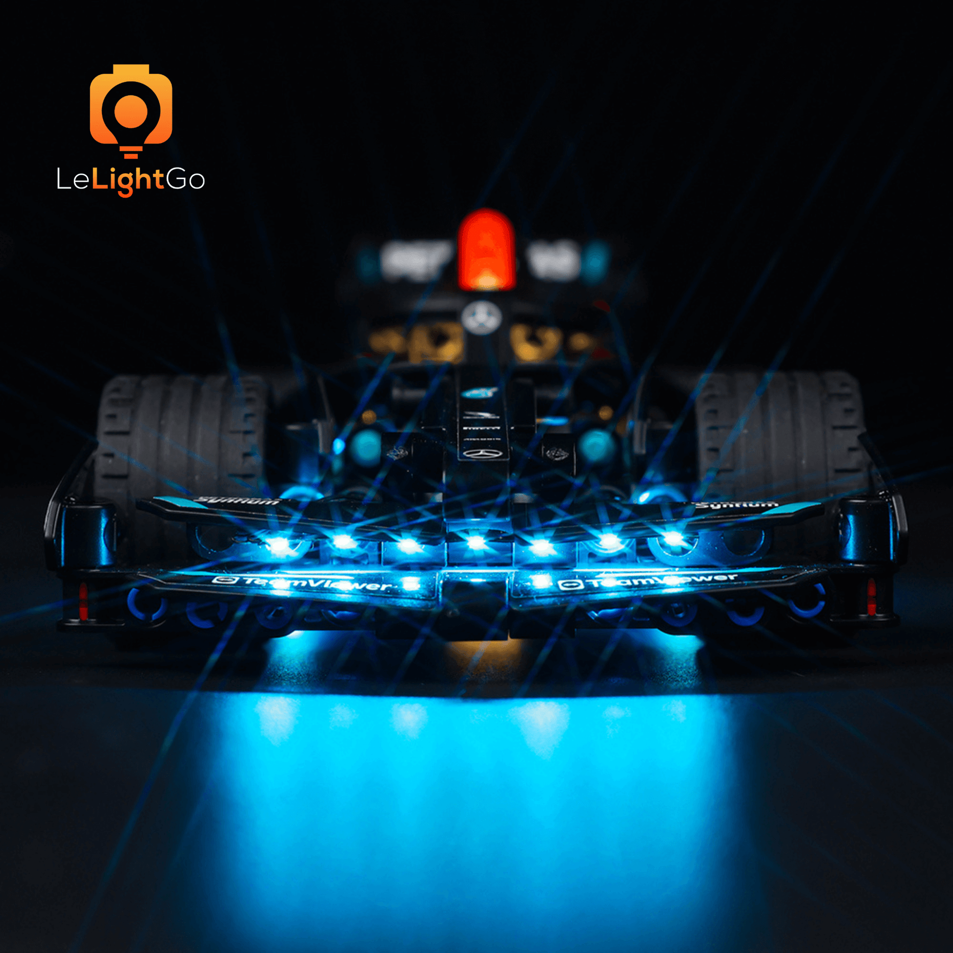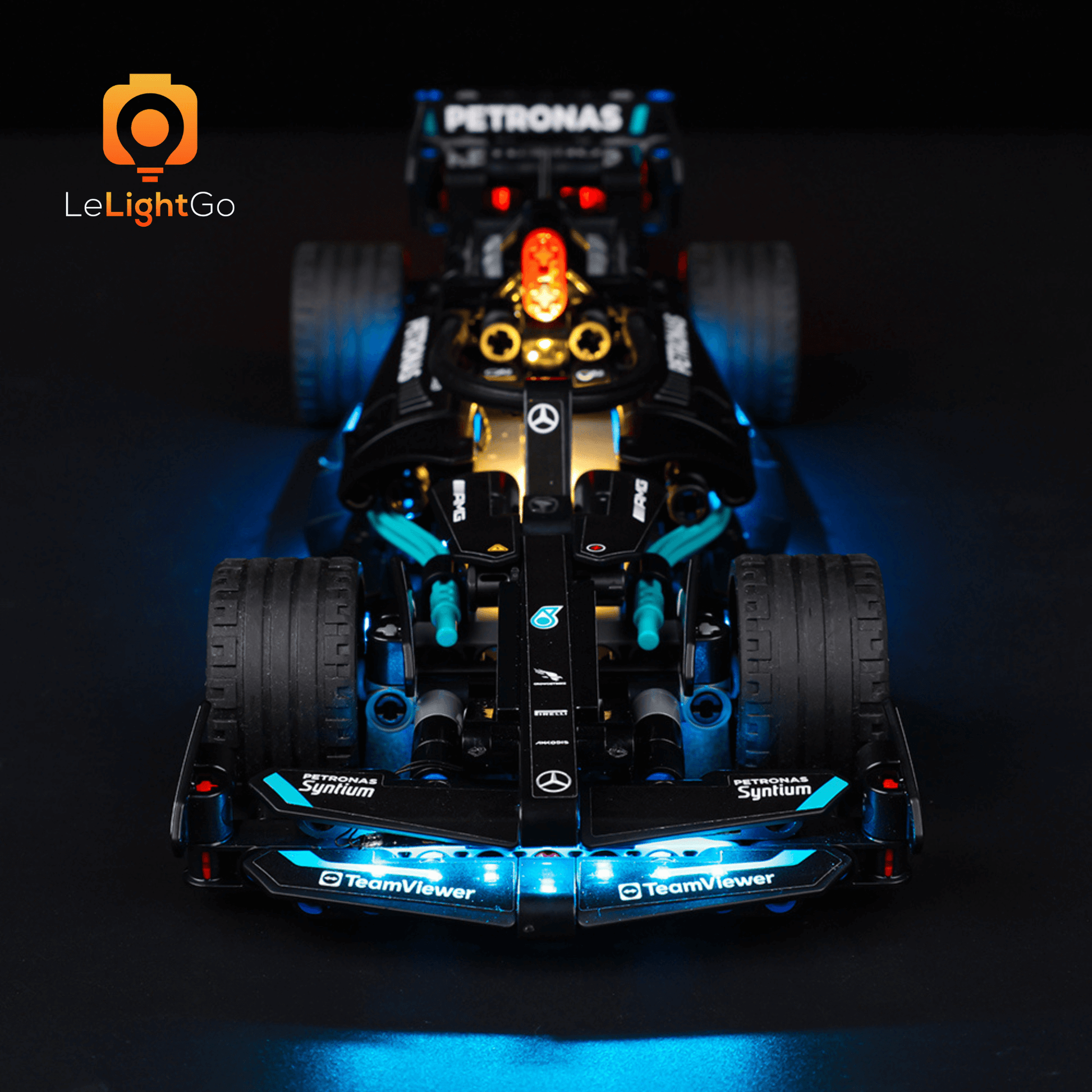 Bring magical shine to your Mercedes-AMG F1 W14 E Performance Pull-Back 42165. This lighting kit is designed especially for the Lego Technic Mercedes-AMG F1 W14 E Performance Pull-Back 42165. This highly detailed Lego model is a spectacle in itself, but when paired with the LeLightGo lighting kit, the charming model comes alive, not only during the day but also at night.