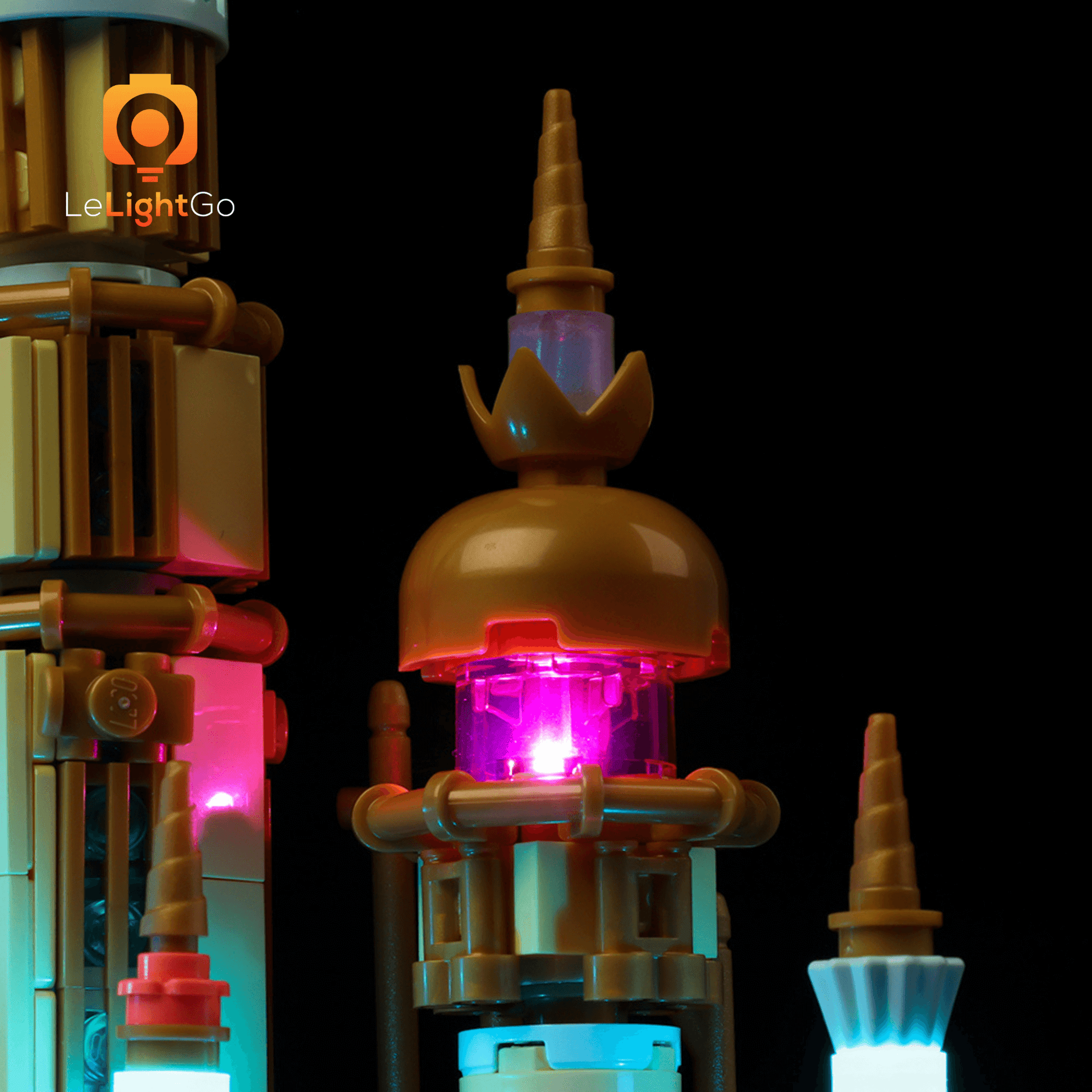 Bring magical shine to your Mini Disney Ariel's Castle 40708. This lighting kit is designed especially for the Lego Disney Mini Disney Ariel's Castle 40708 This highly detailed Lego model is a spectacle in itself, but when paired with the LeLightGo lighting kit, the charming model comes alive, not only during the day but also at night.