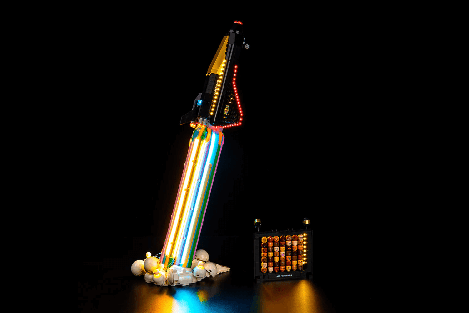 Brilliant lights emphasize the rocket’s creative lift-off and boundless imagination.