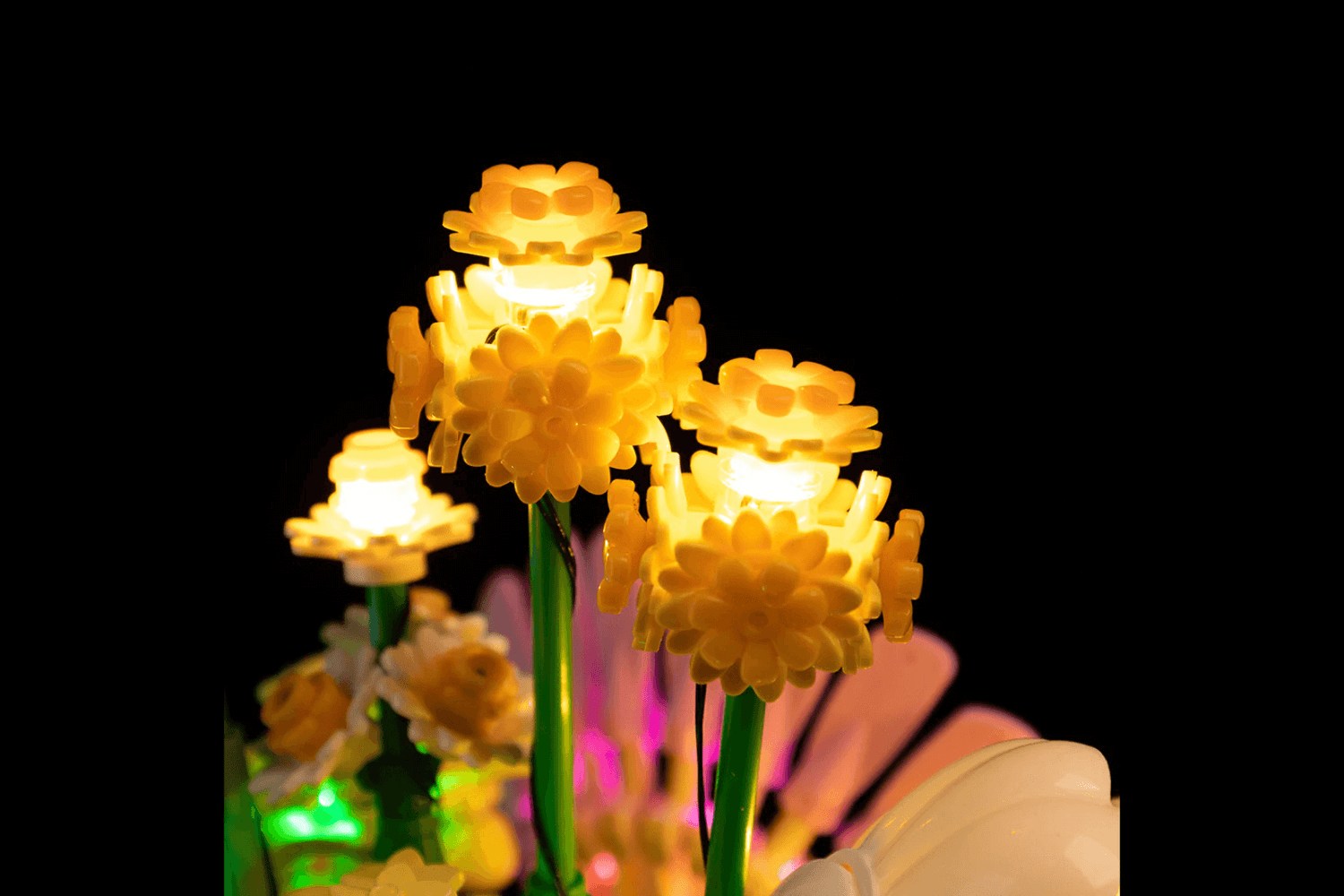 Each flower glows warmly, turning LEGO artistry into living light.