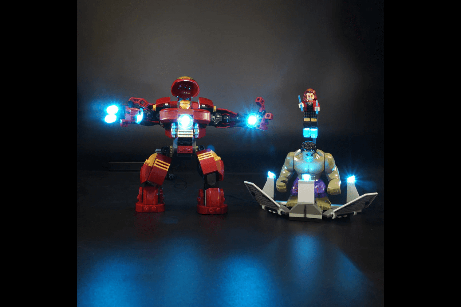 Follow LeLightGo step-by-step instruction video (you can find the video instruction in User Guide and instruction)to light up your The Hulk Buster Smash, something amazing will happen at night. All our kits are plug and play - no electronics knowledge needed!