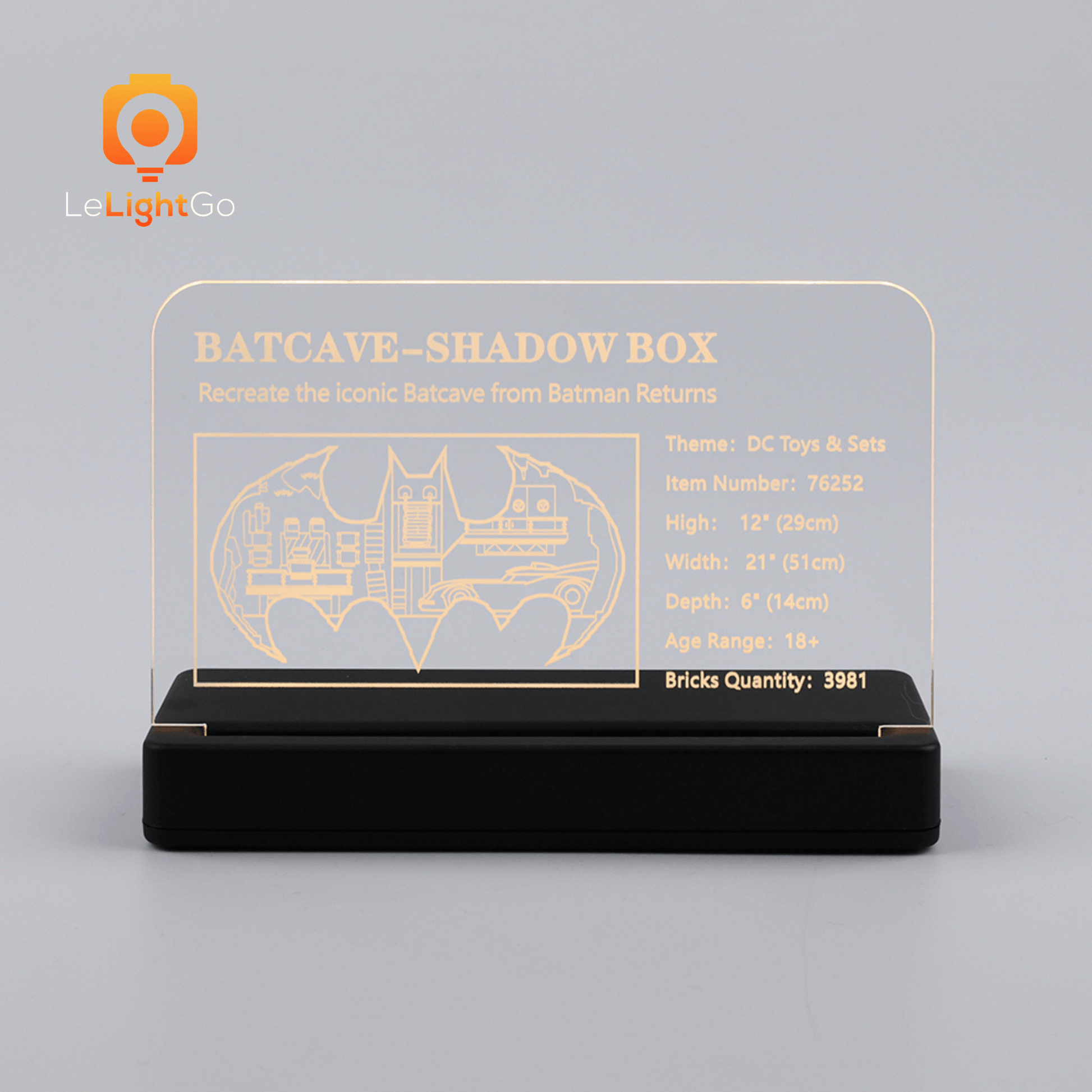 - Clear acrylic nameplate is designed specifically for Batcave – Shadow Box Lego set, the personalized nameplates with graphics and basic information about the LEGO set.