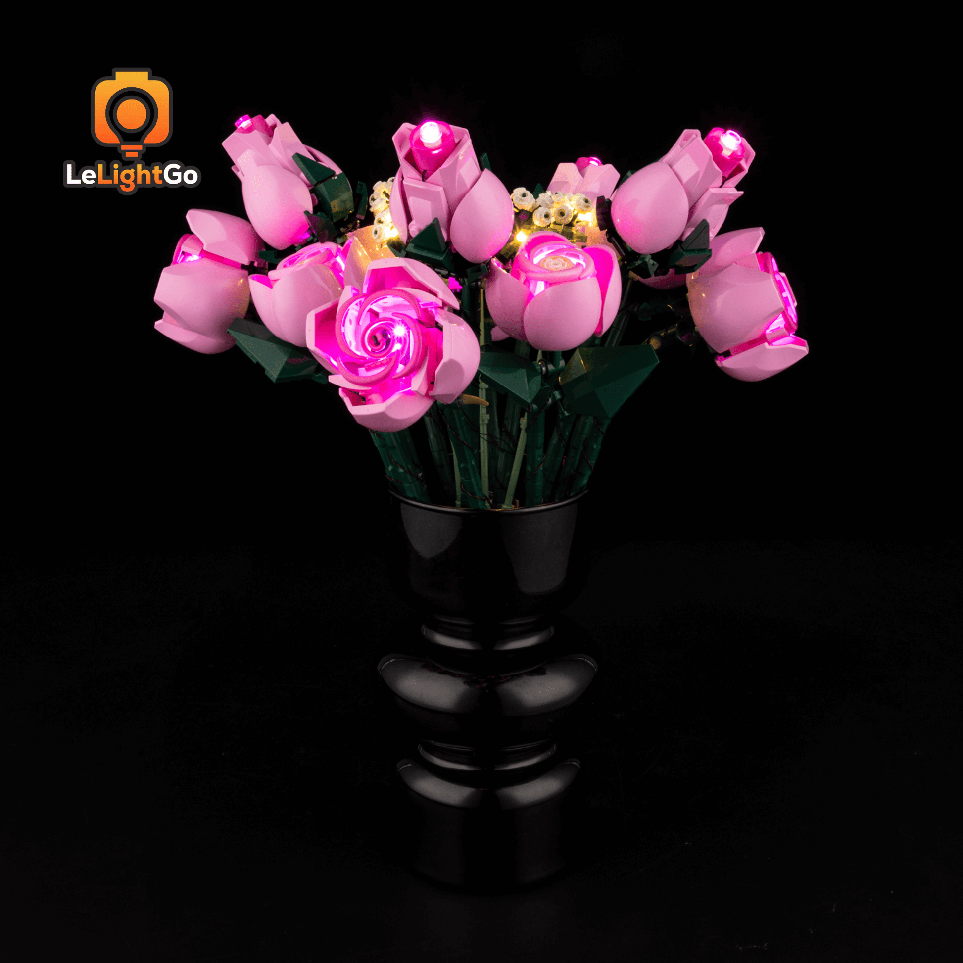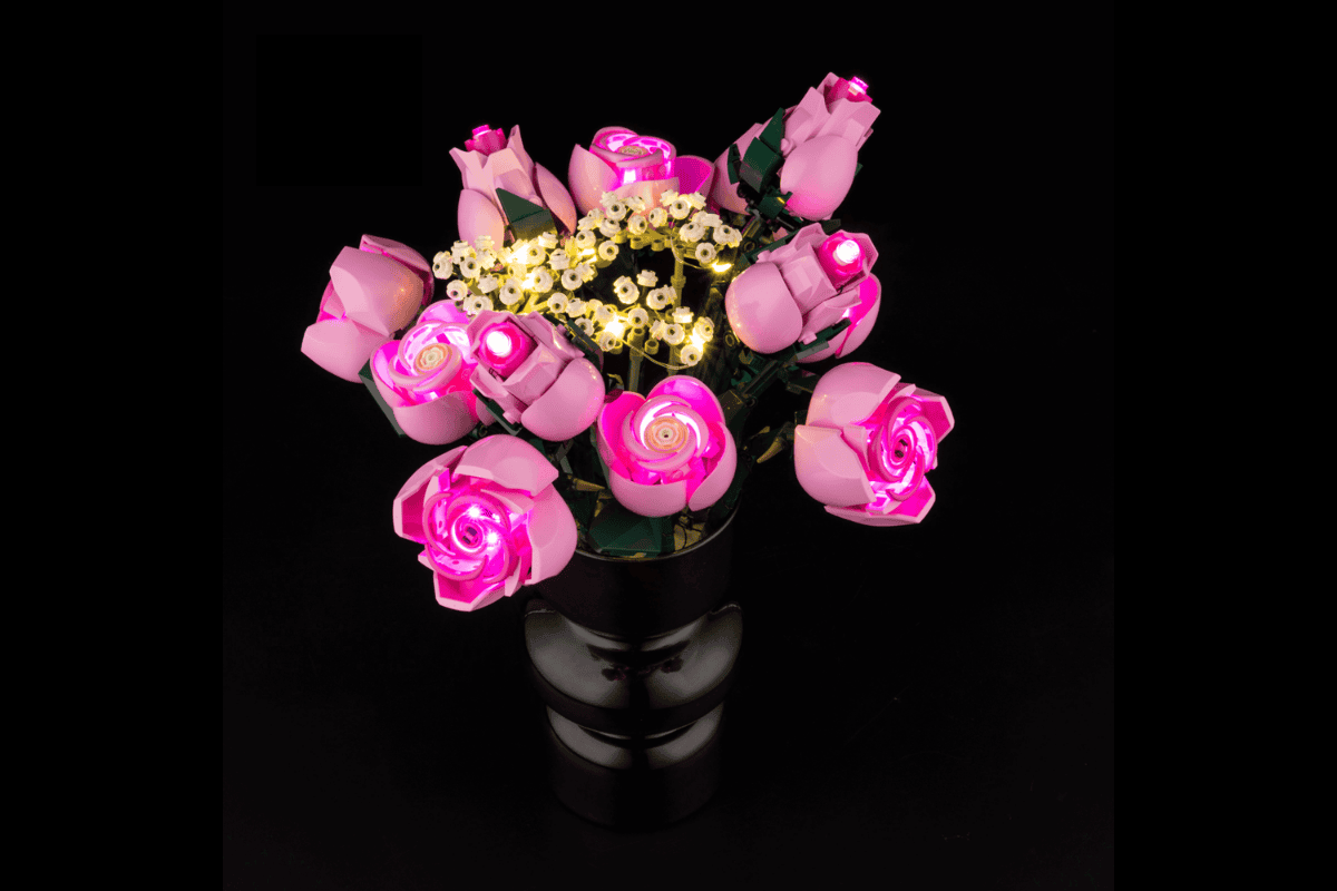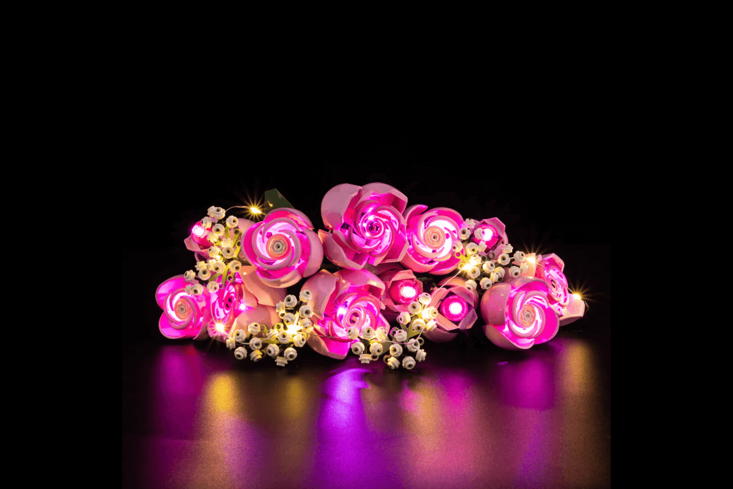 Bring magical shine to your Bouquet of Pink Roses 10374. This lighting kit is designed especially for the Lego Botanical Bouquet of Pink Roses 10374. This highly detailed Lego model is a spectacle in itself, but when paired with the LeLightGo lighting kit, the charming model comes alive, not only during the day but also at night.