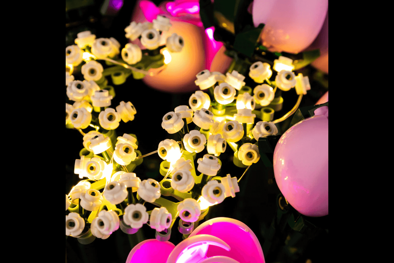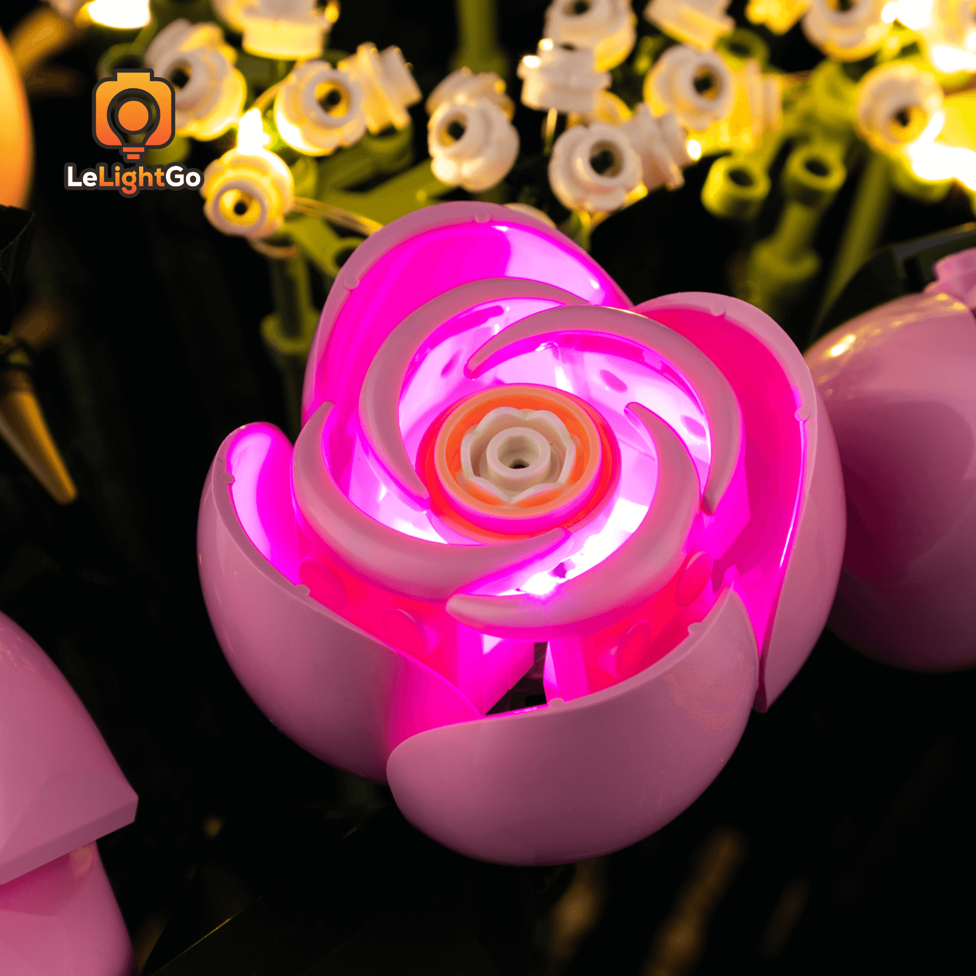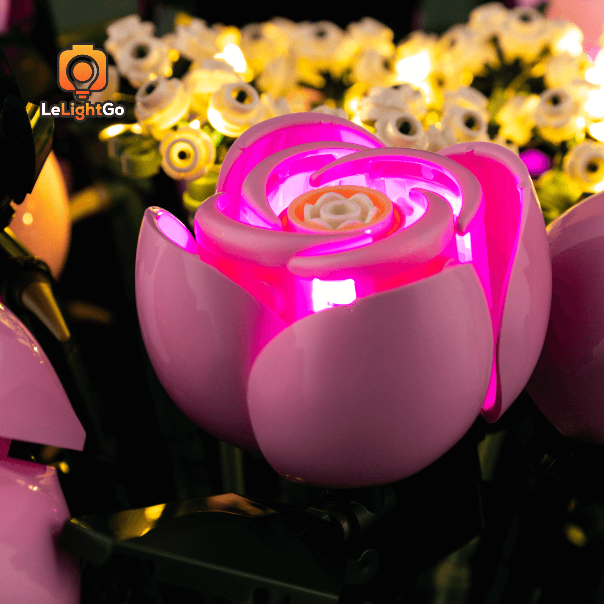 Bring magical shine to your Bouquet of Pink Roses 10374. This lighting kit is designed especially for the Lego Botanical Bouquet of Pink Roses 10374. This highly detailed Lego model is a spectacle in itself, but when paired with the LeLightGo lighting kit, the charming model comes alive, not only during the day but also at night.