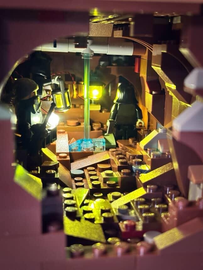 My LEGO Police Station MOC. This is how I modified Lego set 10278 to make a scene of the prisoner trying to break out of jail with this secret Lego tunnel with lelightgo😊👍🏻