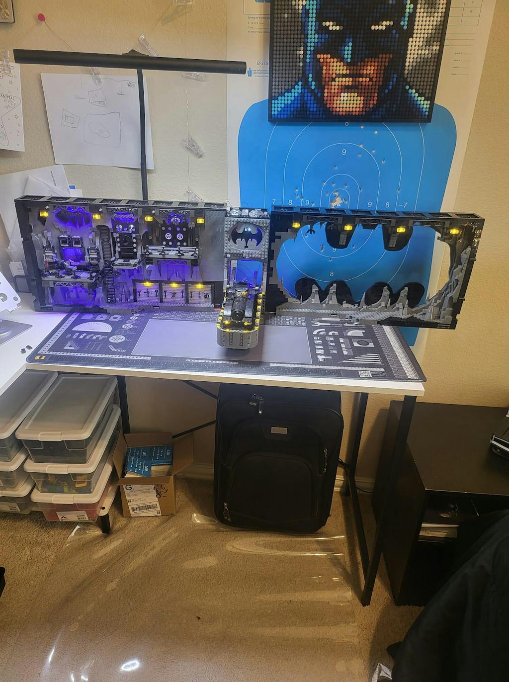 Bright lights reveal Batman’s lair, ready to fight crime.