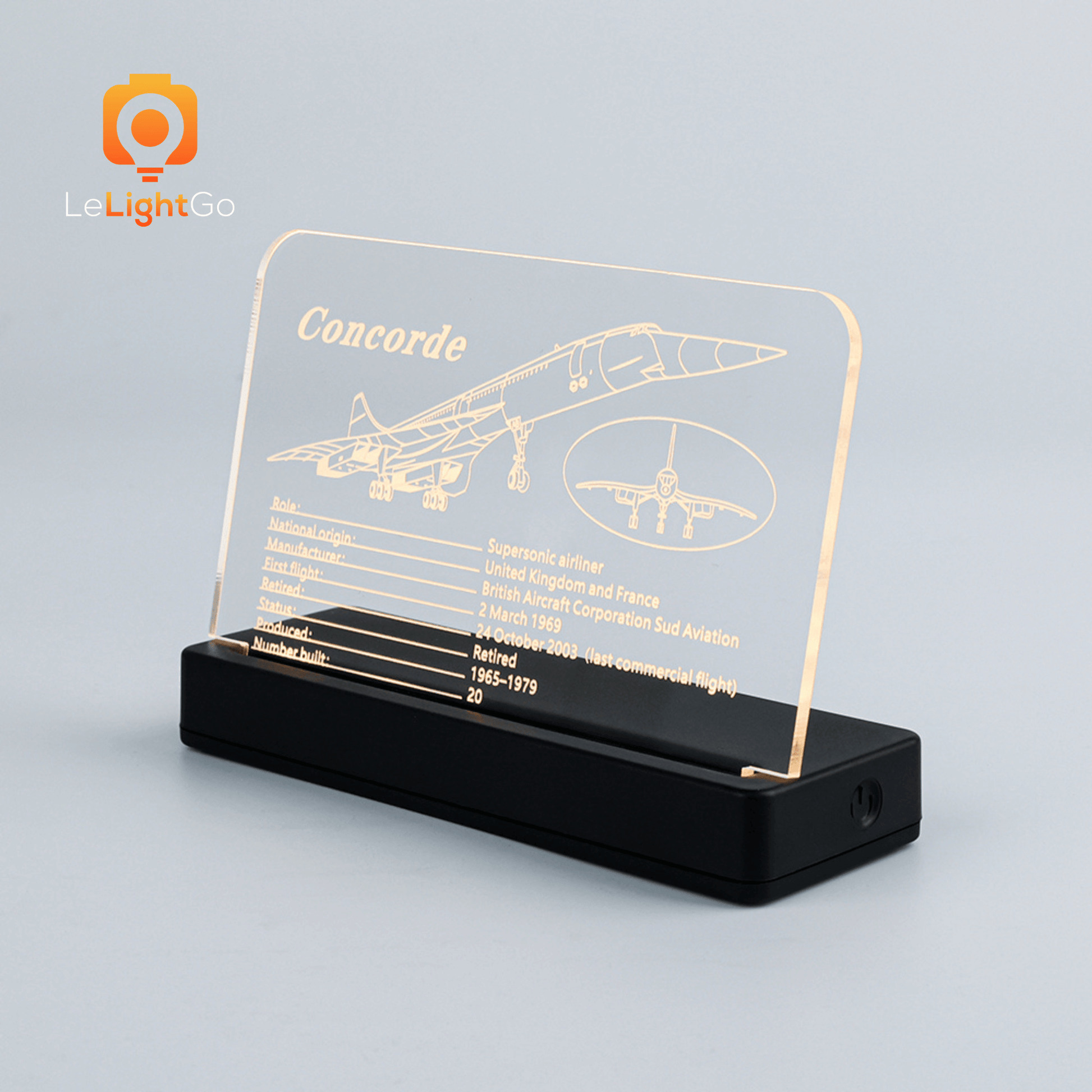 Making Concorde LEGO set more entertaining to see is different from actually building it. Use our fantastic LED Nameplates for LEGO Concorde to exhibit your favorite Concorde set. The nameplates artfully display the set's name along with fascinating facts about the model, the function, the type of the set, and other exciting details.