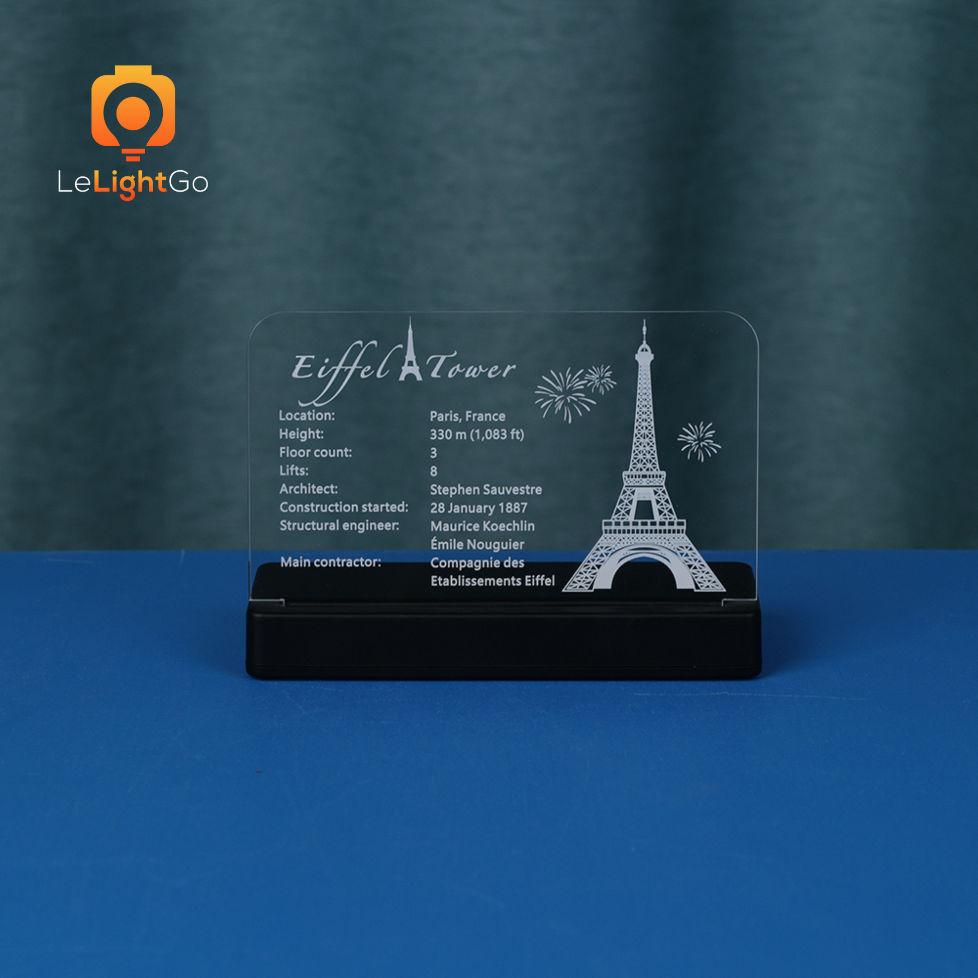 - Clear acrylic nameplate is designed specifically for Eiffel Tower Lego set, the personalized nameplates with graphics and basic information about the LEGO set.