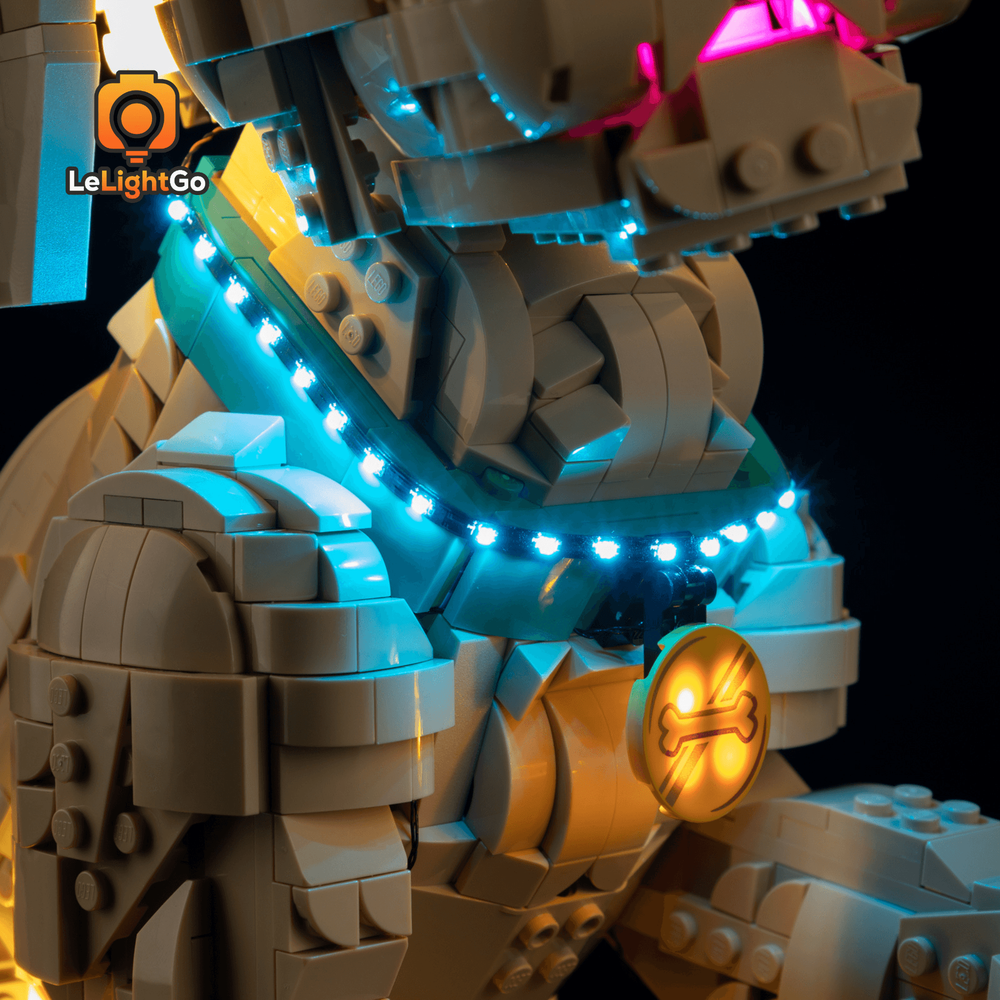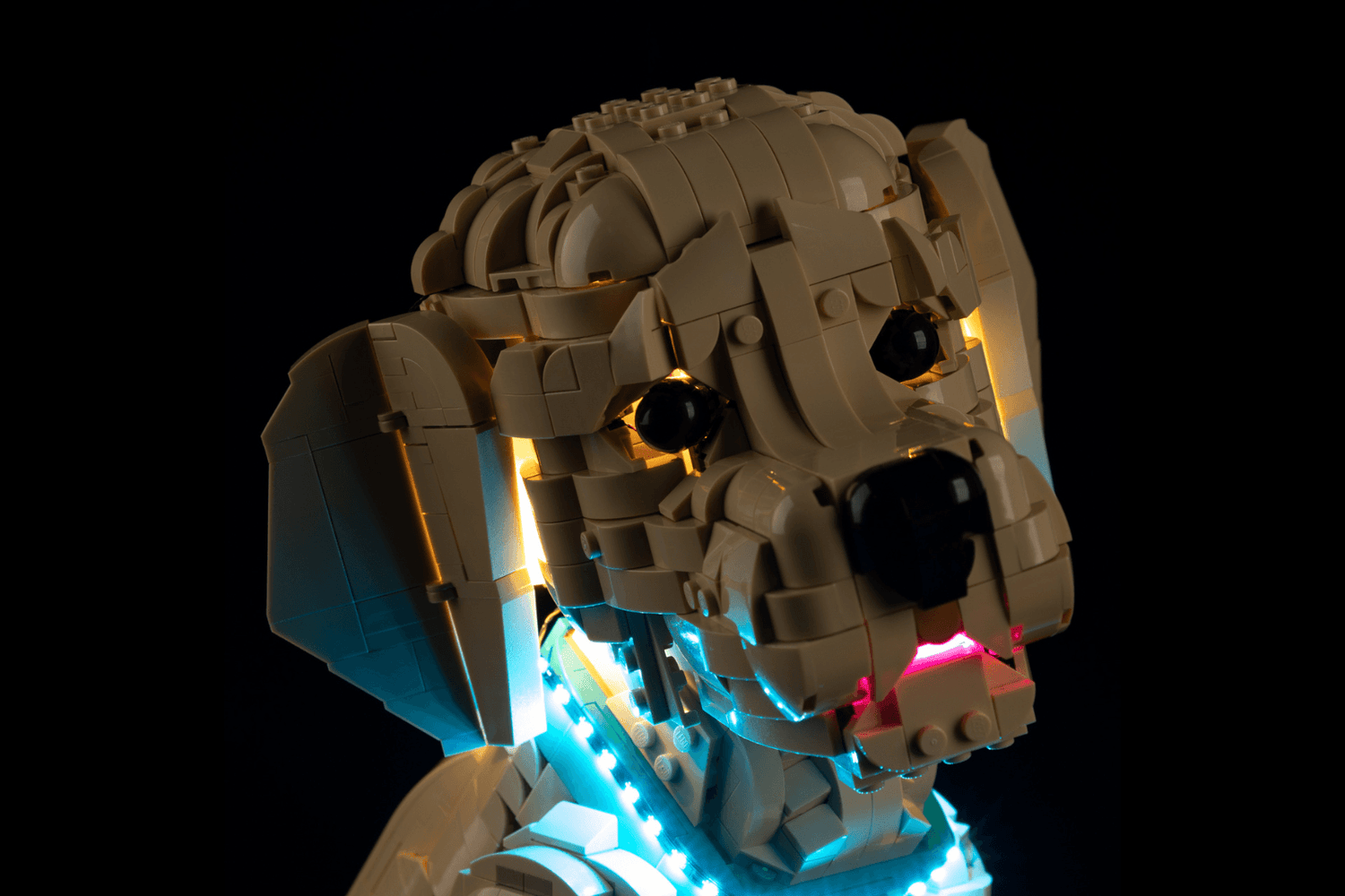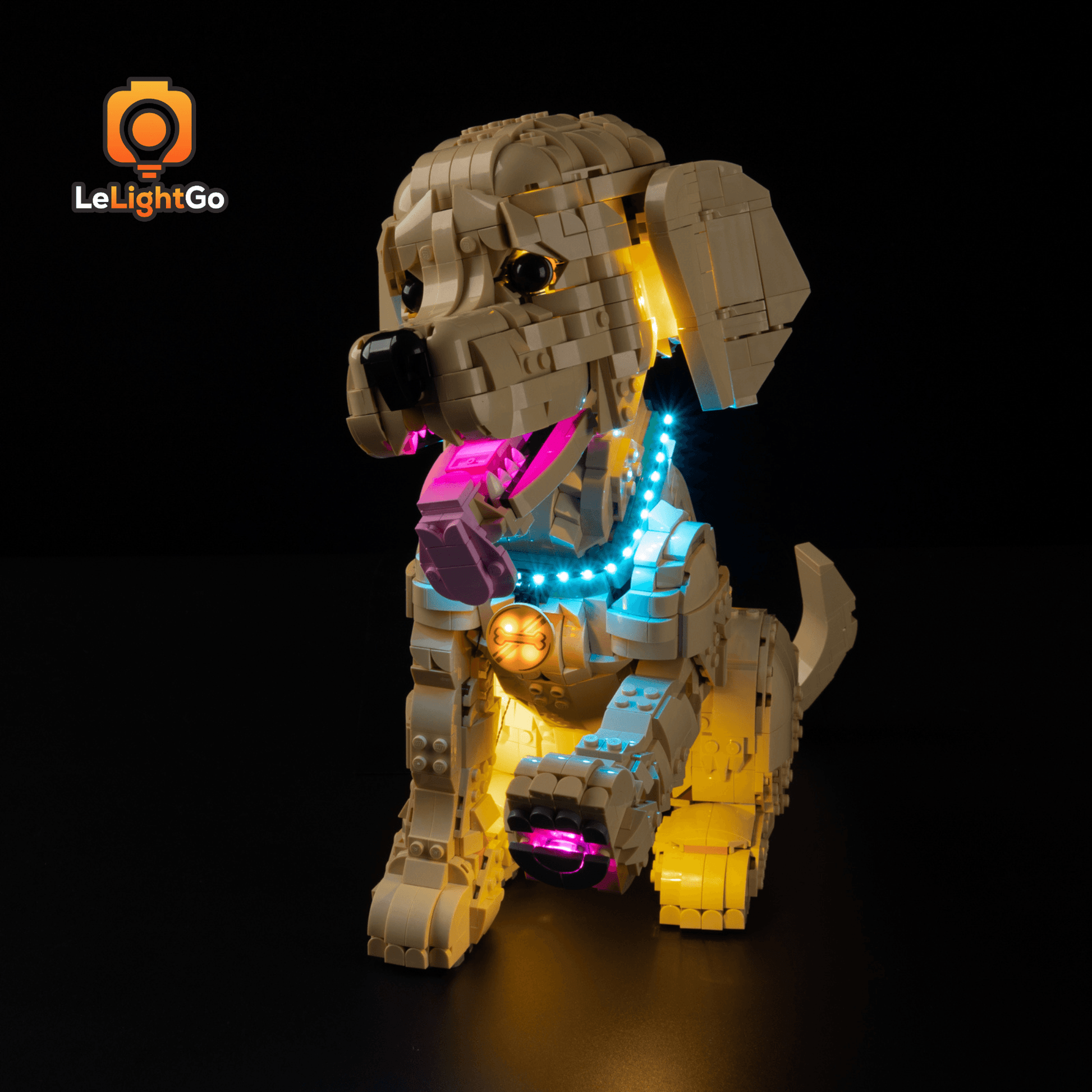 Bring magical shine to your Golden Retriever Puppy 11384. This lighting kit is designed especially for the Lego Icons Golden Retriever Puppy 11384. This highly detailed Lego model is a spectacle in itself, but when paired with the LeLightGo lighting kit, the charming model comes alive, not only during the day but also at night.