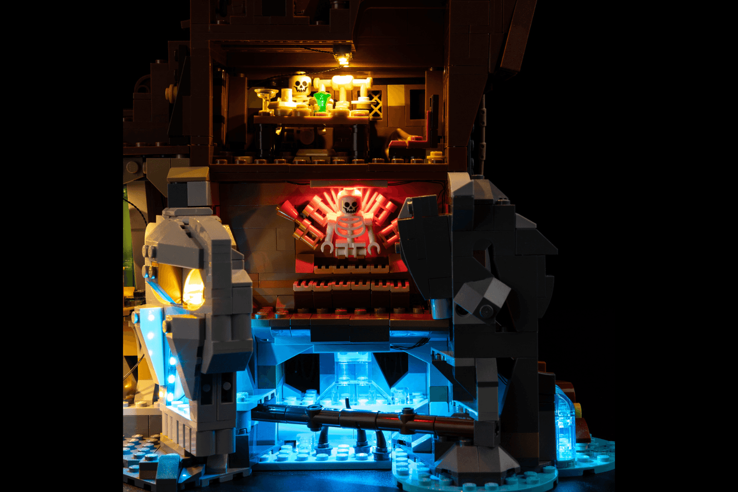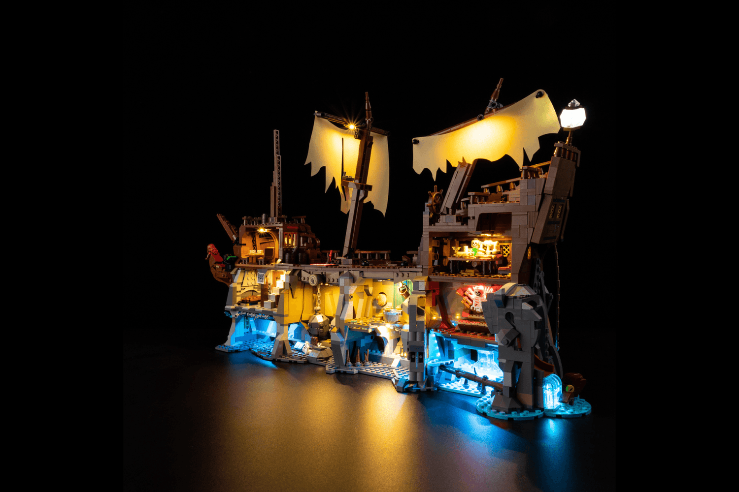 Lights reveal secret caves and glowing pirate gold scenes.