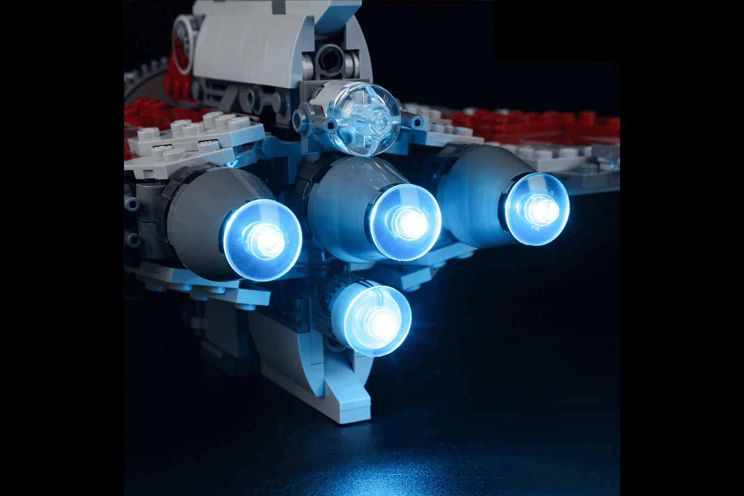 Bring magical shine to your Ahsoka Tano's T-6 Jedi Shuttle 75362. This lighting kit is designed especially for the Lego Starwars Ahsoka Tano's T-6 Jedi Shuttle 75362. This highly detailed Lego model is a spectacle in itself, but when paired with the LeLightGo lighting kit, the charming model comes alive, not only during the day but also at night.